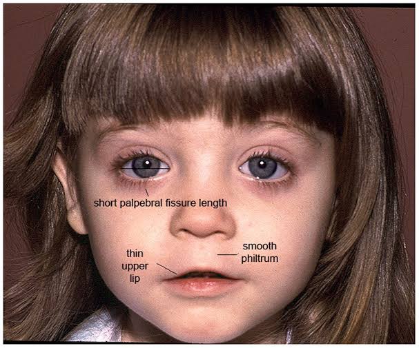 โข Physical Abnormalities: These may include distinctive facial features (such as a smooth philtrum or thin upper lip), growth deficiencies, and skeletal or heart problems.
